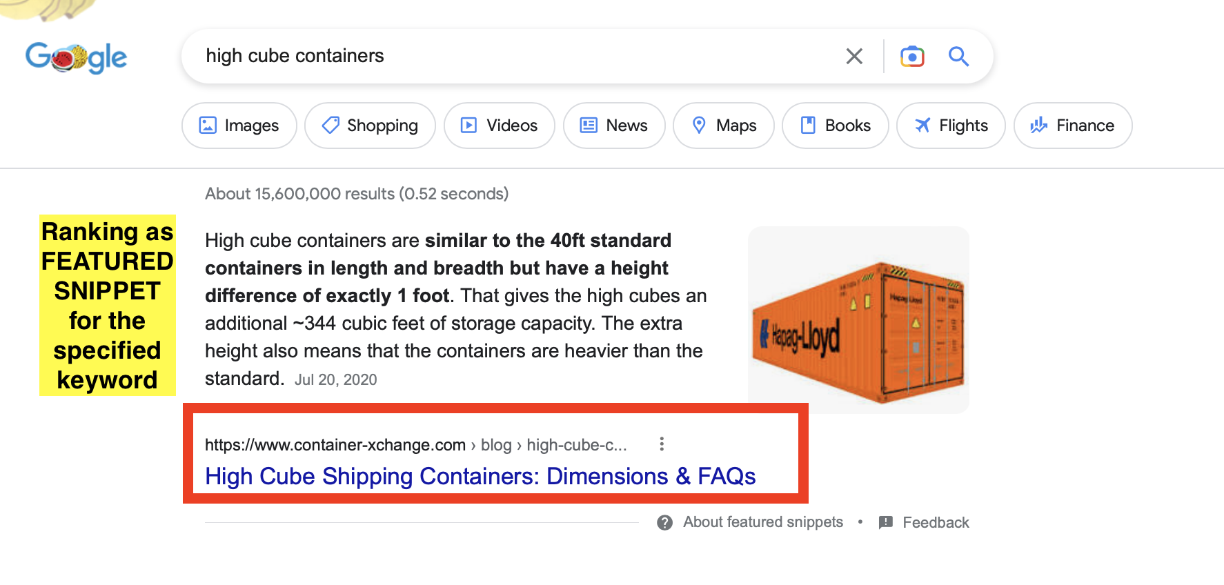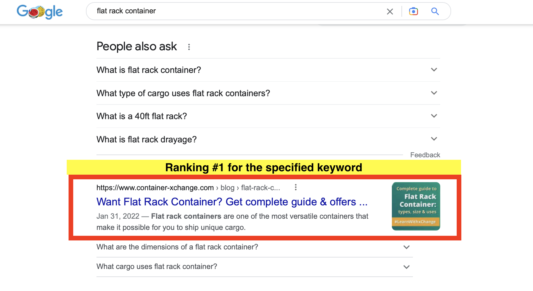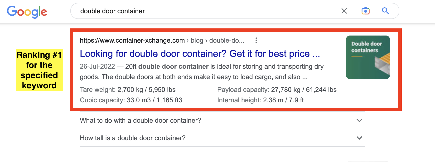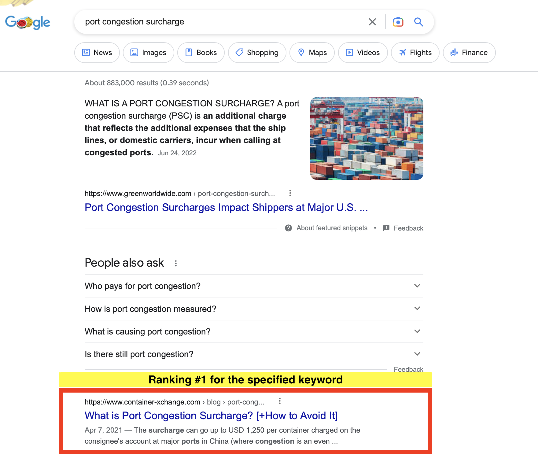 Over the course of 3 years (January 2020 – December 2022), she wrote 100+ content pieces and 500+ company profiles for them. Container xChange’s monthly organic search traffic grew to over 200K with 2.0K referring domains, 13,900+ backlinks, and an organic traffic value of over $135K — with 25+ articles ranking on Google as featured snippets or among Top 3 on SERP.